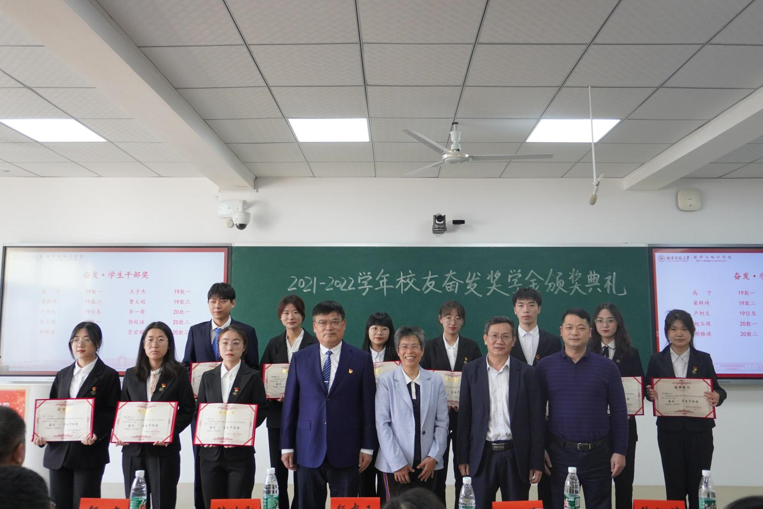 涂榉耀宣读关于公布2021-2022年度校友奋发奖学金的决定。此次奖学金设立“奋发·学生干部奖”与“奋发·竞赛创新奖”,共27名学生获奖。获奖学生分批上台领奖并与颁奖领导合影留念。