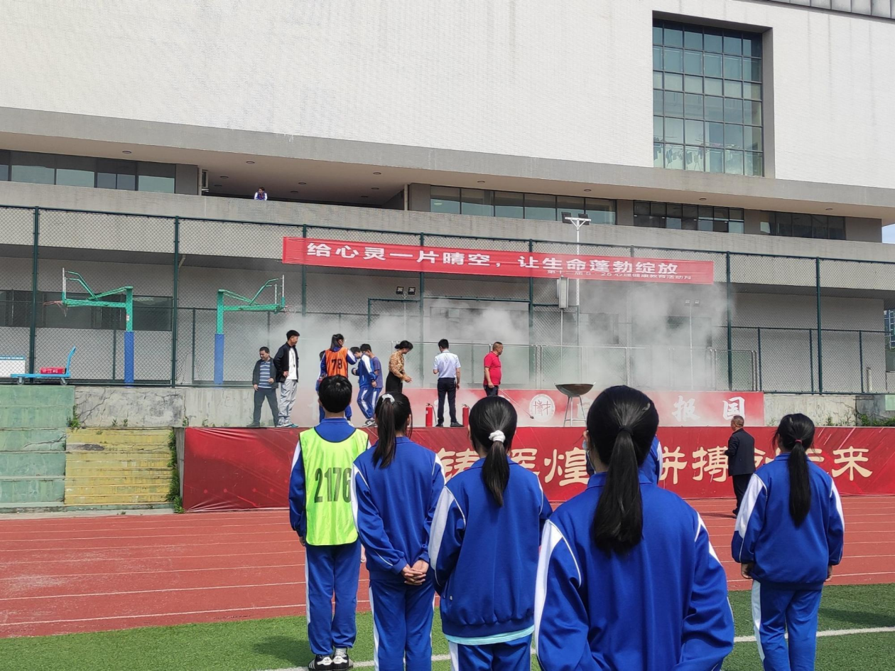警报响起,各班班主任迅速组织学生疏散,实习队员第一时间赶到自己所负责楼层组织疏散学生。各班学生在老师们的指挥下弯腰疾走,用手帕、毛巾捂住口鼻,沿着学校指定路线有序撤离到学校操场的安全区域。各实习班主任清点并向班主任汇报班级人数。全校师生安全疏散。