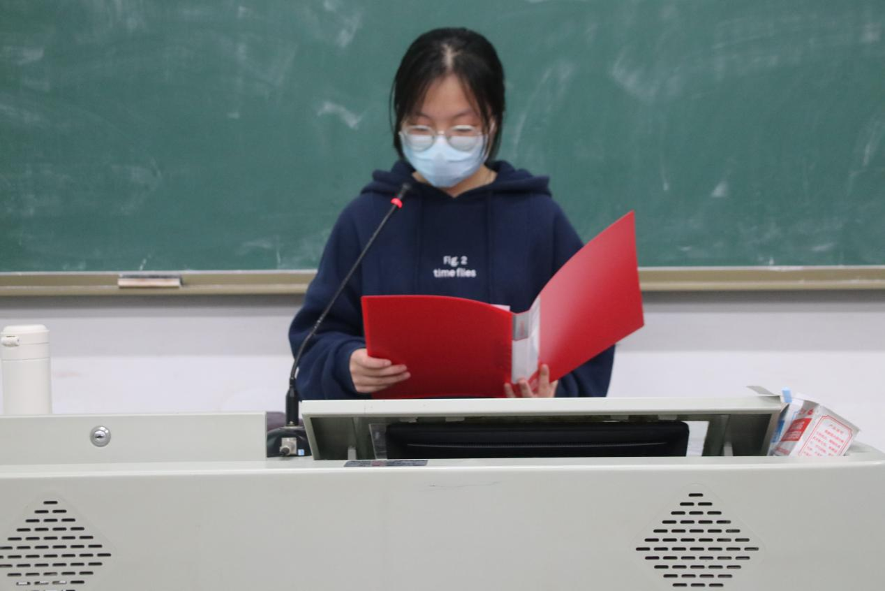 鄢红娟上台讲话。鄢红娟谈及自己充当课程负责人的心路历程。她指出,自己既在这门课程中锻炼了办公的实操本领,又充分提高了与人沟通的能力。她特别对本学期同学们积极配合的学习态度和融洽向上的学习氛围感到欣慰,并相信绝大多数同学都在课程学习中收获到了写作论文的技巧和方法。