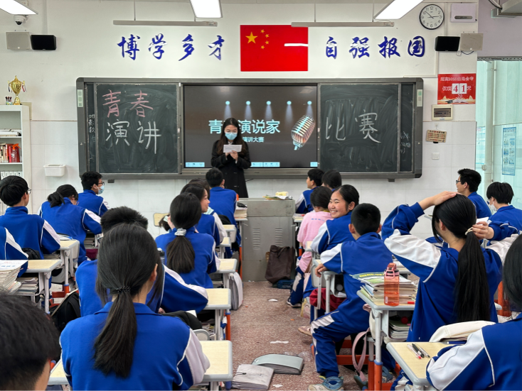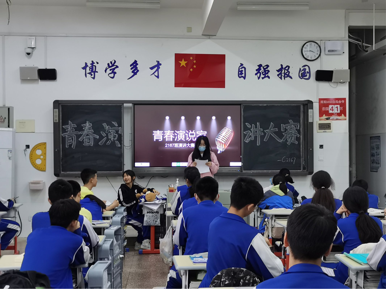 队员何苗和队长邓睿分别担任2166班、2167班的主持人。每班五名学生担任评委。经过一系列宣传动员、演讲培训、初选等一系列环节,五名选手入选最后的班级决赛。主持人宣布开场,选手亮相,学生们在讲台上大展风采,展现青春活力。学生杨佳鑫语言幽默活泼,仪态大方自然,演讲氛围轻松有趣。同学们在他的演讲中哈哈大笑,现场氛围活跃。所有参赛选手演讲完毕,评委对选手的表现进行点评,学生进行投票。比赛结束后现场唱票,票数最高者为进入校赛的选手。
