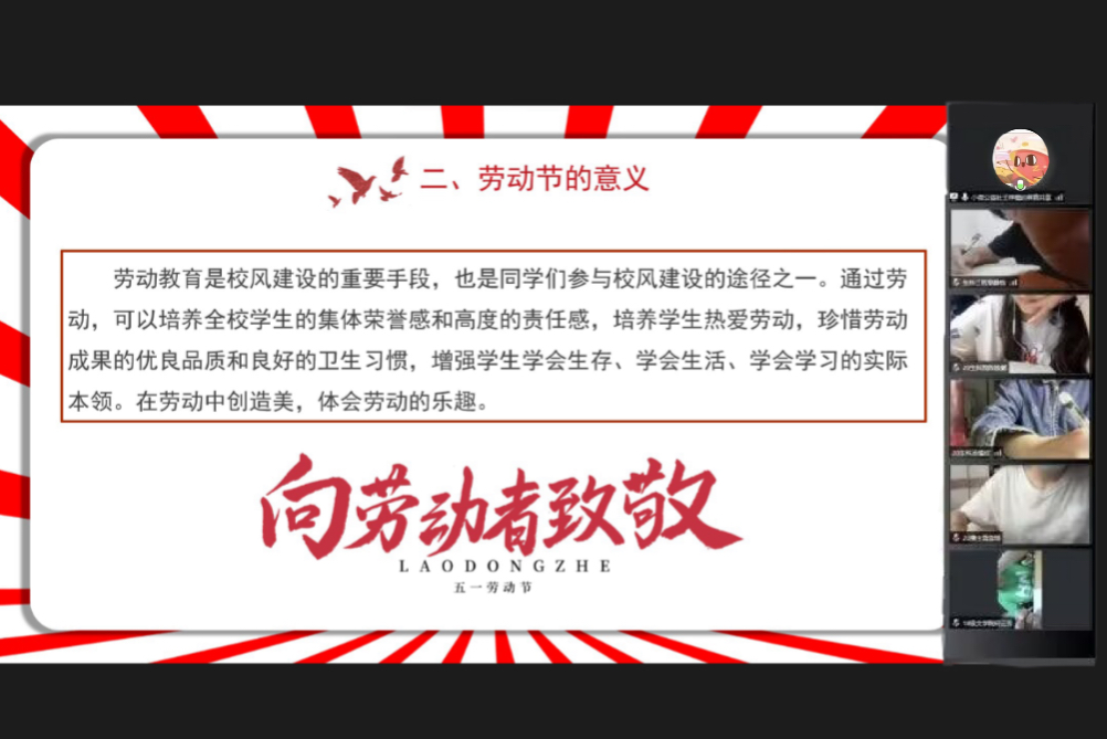 活动分为劳动节介绍,奋斗者们故事分享,奋斗精神内涵阐释,观看劳模视频四部分。肖玉婷向会员们介绍了劳动节的来历和意义,并借门捷列夫、华罗庚、邓亚萍、巩立姣等人的奋斗故事向同学们强调了奋斗对于个人成长和社会发展的重要性。最后,同学们共同观看了劳模视频,在观看视频同时对劳动与奋斗有了更深刻的认识。