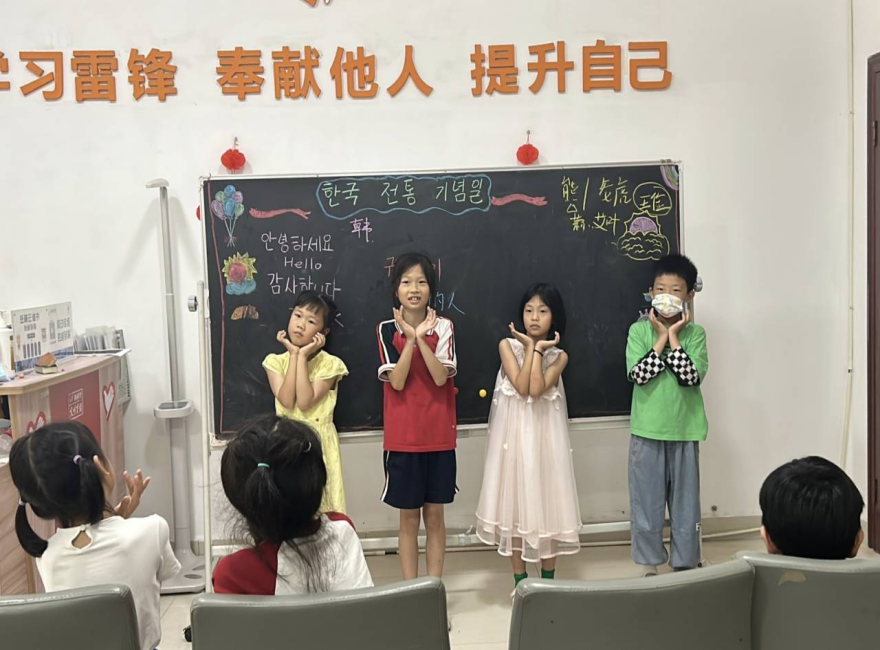 志愿者们以春节、端午节、中秋节等中国传统节日为例,引导小朋友们类比思考韩国的传统节日,通过介绍两国传统节日在起源和习俗上的异同,带领小朋友们了解不同节日的文化特色。在韩语表达的教学过程中,志愿者们寓教于乐,将词汇融入歌曲和手势舞中。在志愿者们的鼓励下,小朋友们积极上台展示学习成果,展现出阳光自信、蓬勃向上的活力风采。