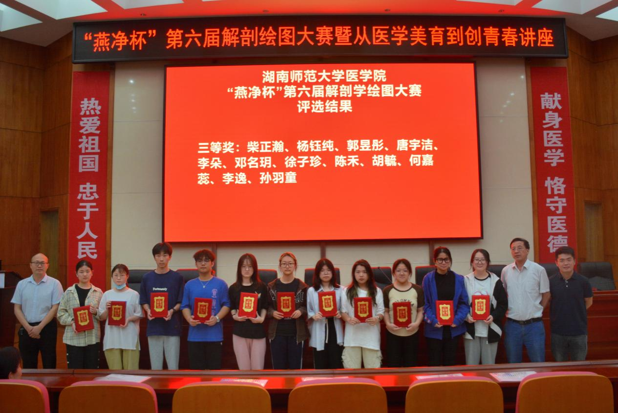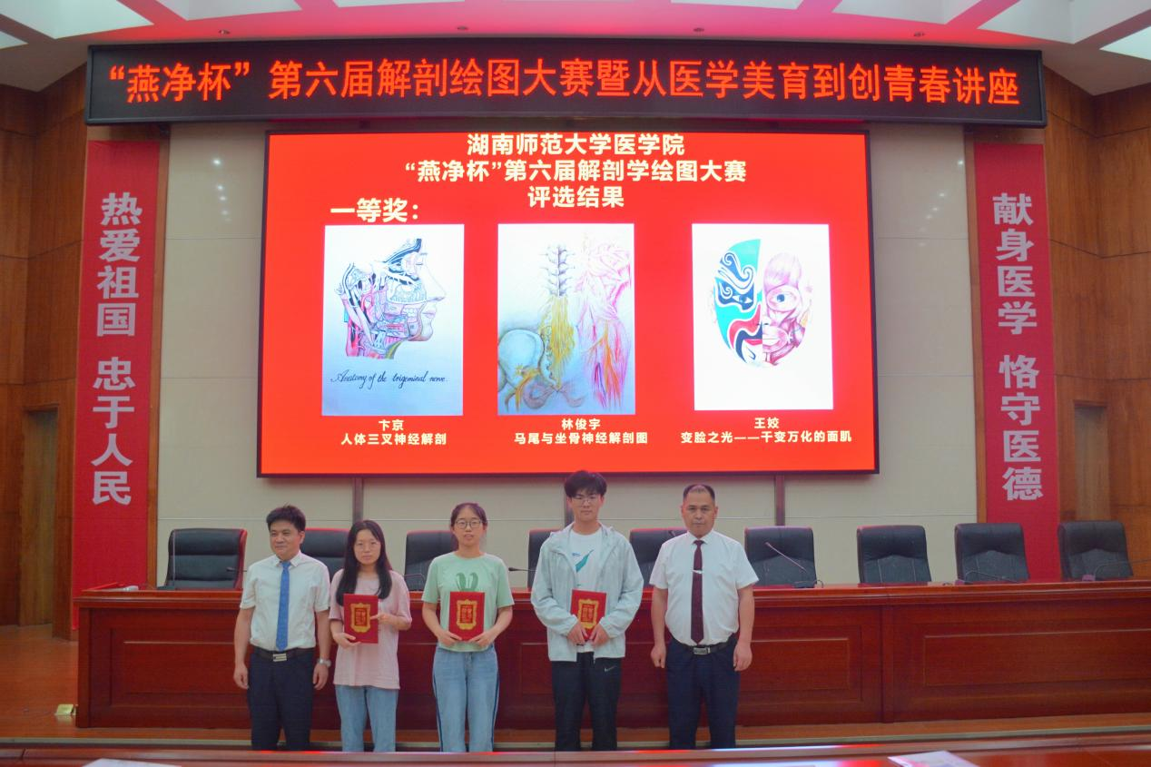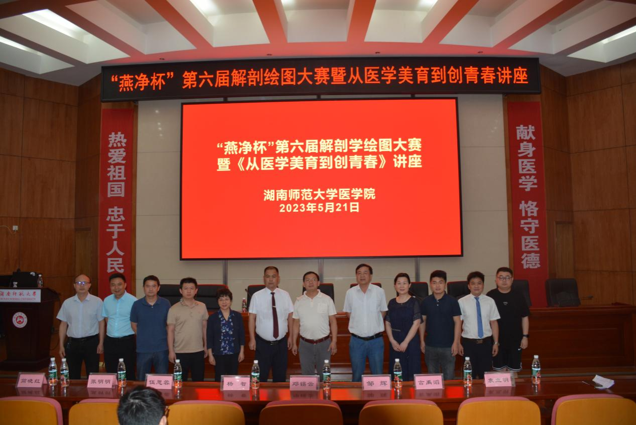 (通讯员 于淼 周春宇 王竟宜)为了进一步推动医学人文美育的发展,5月21日上午,医学院在仁医楼报告厅举办了“燕净杯”第六届解剖学绘图比赛暨《从医学美育到创青春》讲座。此次活动由医学院人体解剖学教研室主任简晓红主持,中南大学湘雅医学院形态学试验中心主任潘爱华,湖南中医药大学解剖教研室主任李新华,长沙燕净生物工程有限公司总经理言禹滔受邀出席活动,医学院院长何祖平、党委书记鄢朝晖、医学院副院长邓文艳参会。