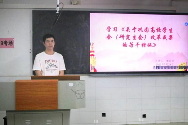 在总体介绍完此次活动的流程后,戴毅龙正式开始组织学习《关于巩固高校学生会(研究生会)改革成果的若干措施》。他分别从《关于巩固高校学生会(研究生会)改革成果的若干措施》的来历、具体学习内容及其重要意义三方面让成员们更深入地了解到习近平总书记关于青年工作的重要思想。他着重讲述了《关于巩固高校学生会(研究生会)改革成果的若干措施》的具体学习内容,从把牢政治方向到抓实队伍建设再到压实工作责任步步推进,使学生会各成员深切感受到党的温暖,愿意积极响应党的号召,听党话,跟党走。