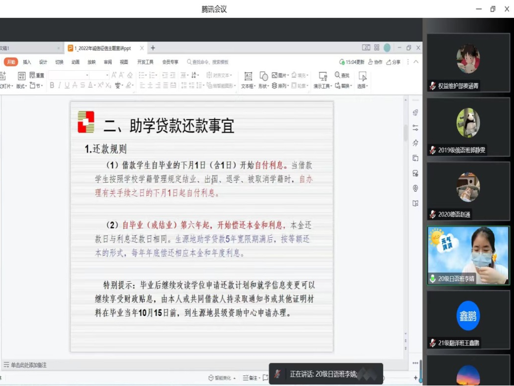 在“诚信、征信”主题宣讲会上,外国语学院优秀资助宣传大使李婧为同学们讲解有关国开行助学贷款及还款的相关事宜,并耐心解答同学们提出的在贷款及还款过程中遇到的各类问题。外国语学院资助专干王昭春老师组织助学贷款毕业生进行还贷确认,并对其进行还款教育。在教育会上,王昭春系统地向同学们普及诚信及金融知识,介绍还款办理程序及相关政策,强调了按期还贷的重要性,提醒同学们失信行为将带来的不良影响。