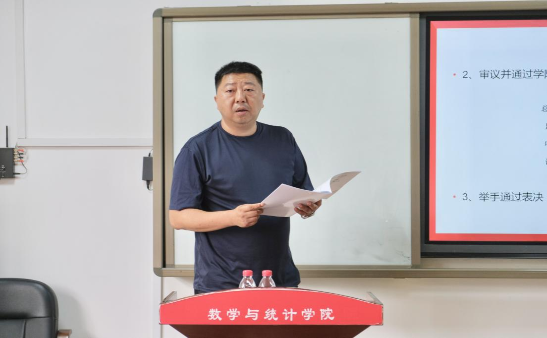 数统院院长李利平作学院工作报告。他以数统院近两年的工作情况为导向,指出数统院在改善学院条件,提升师生幸福感,加强学科平台建设,推进科技创新服务,规范学生教育教学管理,培养高质量人才等方面取得的成就。随后,他对第八届教代会工作提出三点展望:第一,进一步加强理论学习,强化思想引领;第二,进一步强化民主管理与监督,提高提案办理质量;第三,进一步加强自身建设,提高教代会委员的履职能力。