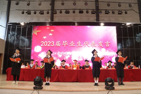 2023届毕业生代表李锐、侯文灿、冯译慧、韩金刚发言。他们对学院领导老师的支持与栽培、同窗亲友的陪伴与鼓励表示感谢,并结合个人经历,分享了自己在学院四年生活学习的感悟,表达了自己将不忘来路,砥砺前行,以实际行动践行我校“仁爱精勤”校训的决心。2023届毕业班辅导员朗诵《致敬青春》,为全体毕业生送上关于青春的祝福,激励他们迈步从头越,风起再扬帆。