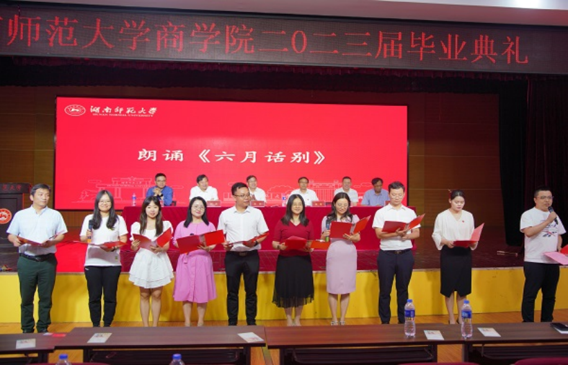 会计学系主任马巾英,国际经济与贸易系老师戴家武,管理学系主任阳毅,经济学系老师谢迟、杨柳,以及研究生办和学工办全体老师朗诵《六月话别》,表达对毕业生们的不舍与留恋。2019级本科毕业生蔡雨彤、惠婉莹、胡鑫,2021级徐嘉俊和2022级刘璟烨、麻正博为毕业生们带来歌唱表演《记念》,表达对毕业生们的依依惜别与祝福。