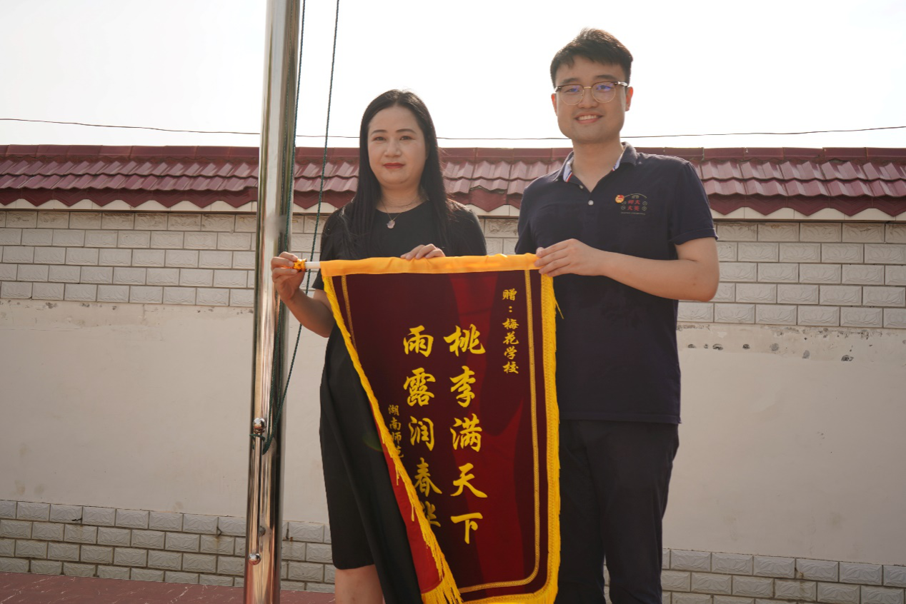 丛杨发言,他对校领导提供实践机会与给予帮助表示感谢。他简单介绍了此次社会实践活动的内容,并提出以下要求:同学们要树立安全意识、加强沟通保障,实践团成员要秉承“义务支教,用心支教”的理念,总结经验,收获成长。随后,文学院向梅花学校赠送锦旗,全体成员合影留念。