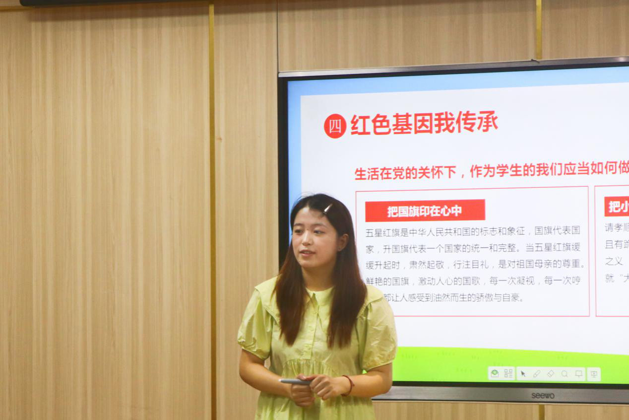 活动正式开始前,姜瑜播放中国共产党百年史宣传视频,引导同学们学习视频中关于共产党百年历史中的重要节点。姜瑜向同学们讲述刘胡兰、张富清等革命先辈的丰功伟绩和崇高精神,同学们认真听讲,并积极分享自己了解到的革命故事。姜瑜带领学生回首百年征程,重温建党历史,致敬英雄人物,汲取成长力量,并教导同学们“崇尚英雄才会产生英雄,争做英雄才能英雄辈出”。活动最后,同学们和实践团队员一起合唱《没有共产党就没有新中国》,感受党的百年光辉历程。