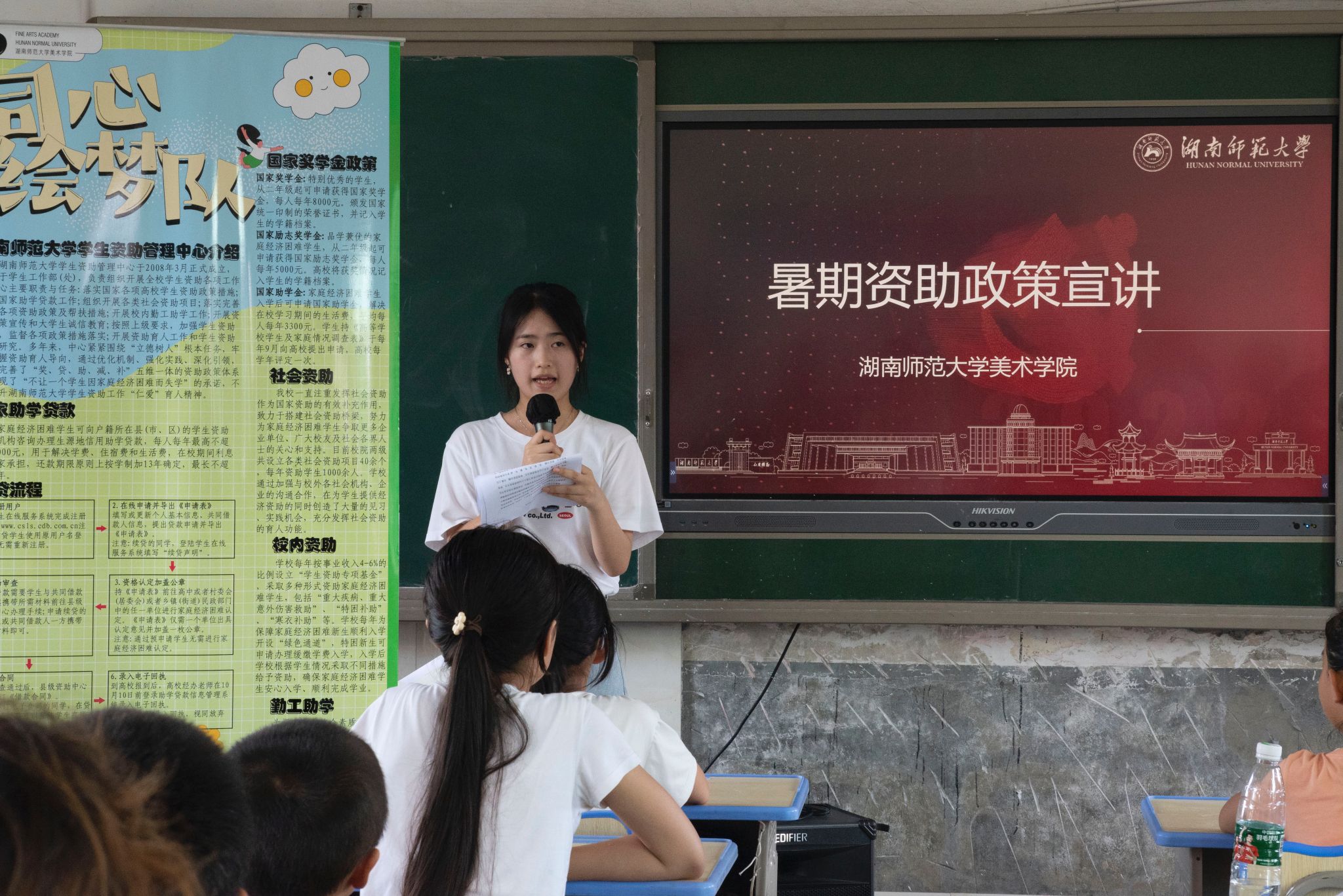 (通讯员 谭竞 庄栩乐)为深入落实国家资助政策,响应我校宣传国家资助和助学贷款政策工作的部署,我院以暑期社会实践时期为契机,进一步增进乡村学子对国家资助和助学贷款政策的深入了解。7月3日下午,美术学院“同心绘梦”队赴益阳市张家塞乡胜利小学开展“解读未来,共筑梦想”资助政策宣讲会,会议由美术学院学生工作办公室辅导员唐士晋主持,外国语学院2022级本科生黄薪诺主讲。