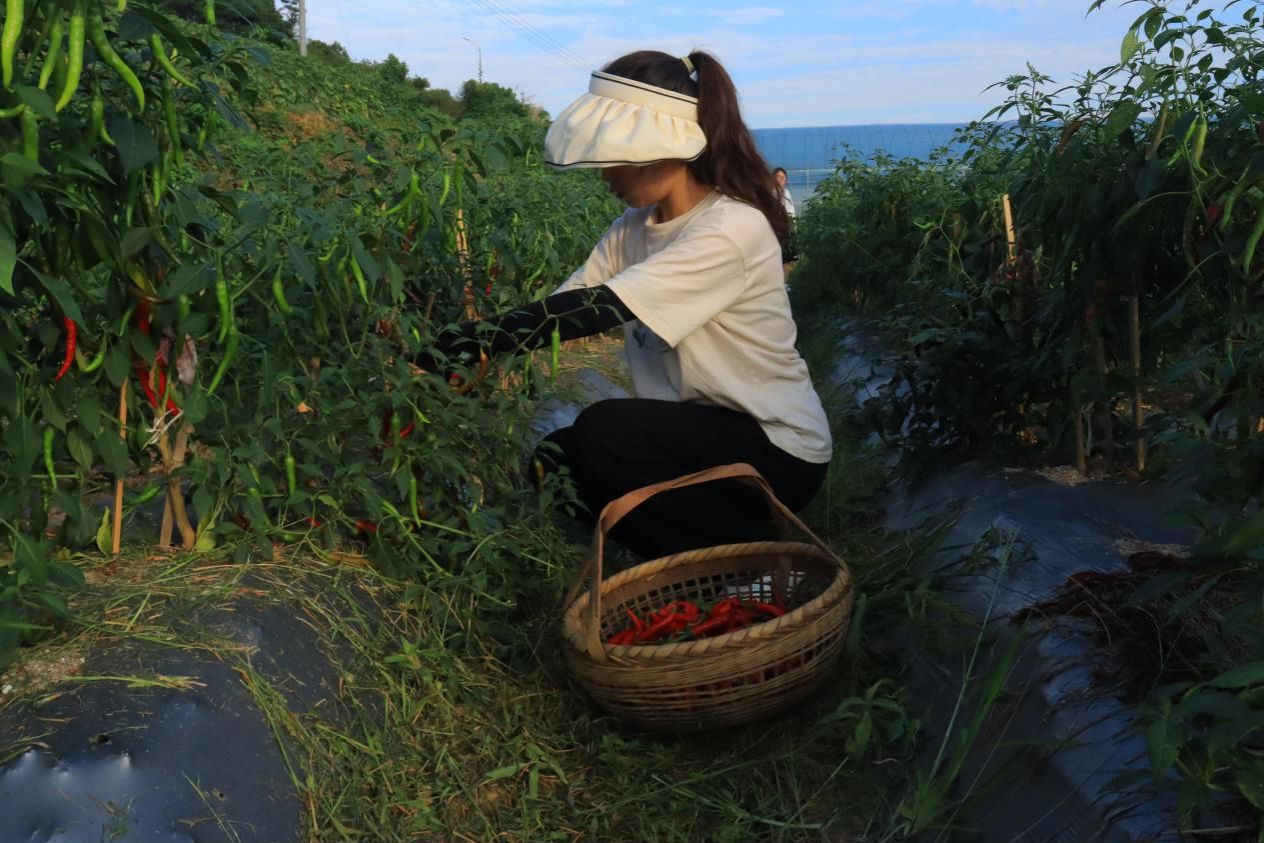 在彭志霞的指导下,实践团成员提着竹筐,开始了辣椒的采摘。彭志霞介绍道,上午九点前是玻璃椒的最佳采摘时段,采摘过后工人们将对鲜辣椒进行产品加工。除了产业园中的辣椒,公司还会收购村民们自家种植的玻璃椒,帮助村民打开销路,激发村民们种植玻璃椒的积极性。
