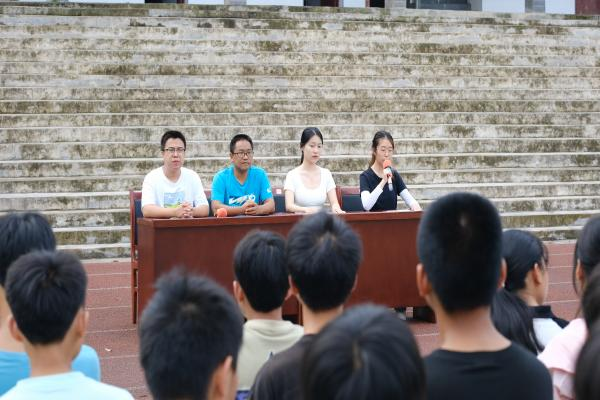 当日上午9点整,在洞下场学校各领导、老师们的协助下,开营仪式如期在洞下场学校操场召开。会议由此次暑期社会实践活动副队长王欣乐同学主持。洞下场学校校长杨学伦在会上对此次活动表示了欢迎和支持,对我校学子提出了殷切期望,希望我校学子能在学习和生活上都多多引导,支持和鼓励洞下场学校的孩子们。副校长冯玉璋对杨学伦的发言进行了补充,强调了学校各项安全防范相关内容。此次暑期社会实践活动队长巫秋雯同学表达了对学校大力支持我队各项工作的感谢,并向全体师生介绍了此次活动的课程安排和特色项目。