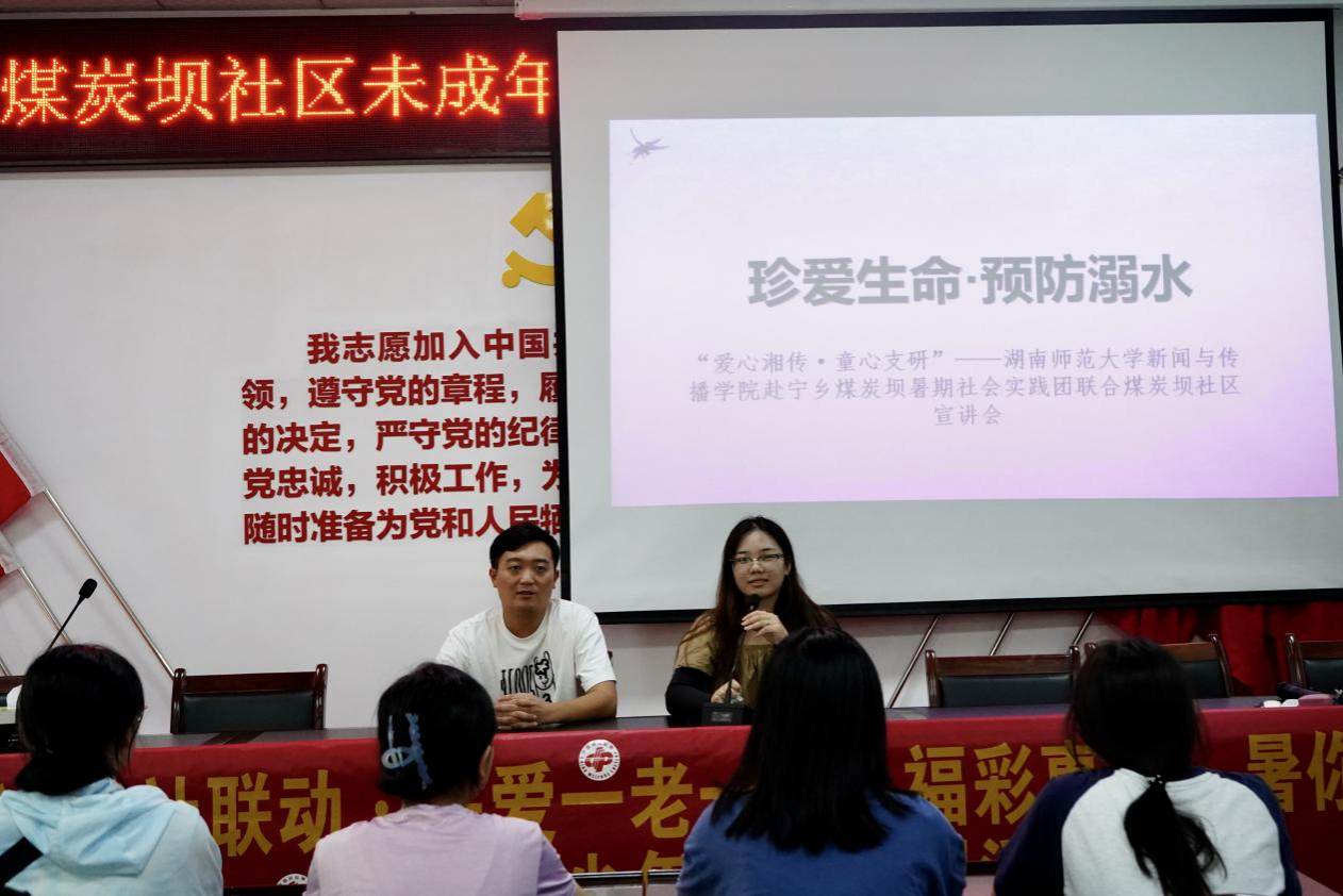 (通讯员 蔡田甜)7月7日,“爱心湘传,童心支研”——我校新闻与传播学院赴宁乡市煤炭坝暑期社会实践团联合湖南美心社会工作服务中心组成宣讲团,在煤炭坝社区居民委员会会议室举行防溺水宣讲会,教育引导社区青少年儿童,不做孤“泳”者。