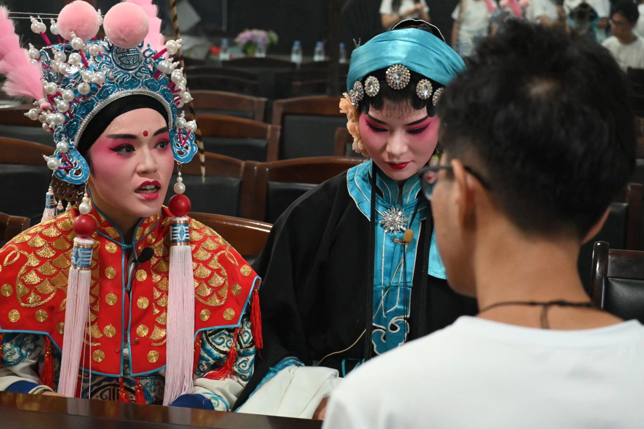 活动中,刘雅玮从祁剧历史渊源、流派演变到当代保护措施,向实践团介绍了祁剧的发展历程与现状。她指出,祁剧作为湖南地方戏曲代表,保留其特有的的表演风格与唱腔体系,于2008年列入国家级非物质文化遗产名录(第二批),成为湖湘文化符号。随后,谭湘香、刘倩现场表演《李三娘》“打猎”选段,展现祁剧的唱腔与身段技艺。在互动环节,实践团成员与演员们进行交流,两位演员分享了学艺经历,提及“唱、念、做、打”基本功训练的艰辛,表达了对祁剧传承的使命感。