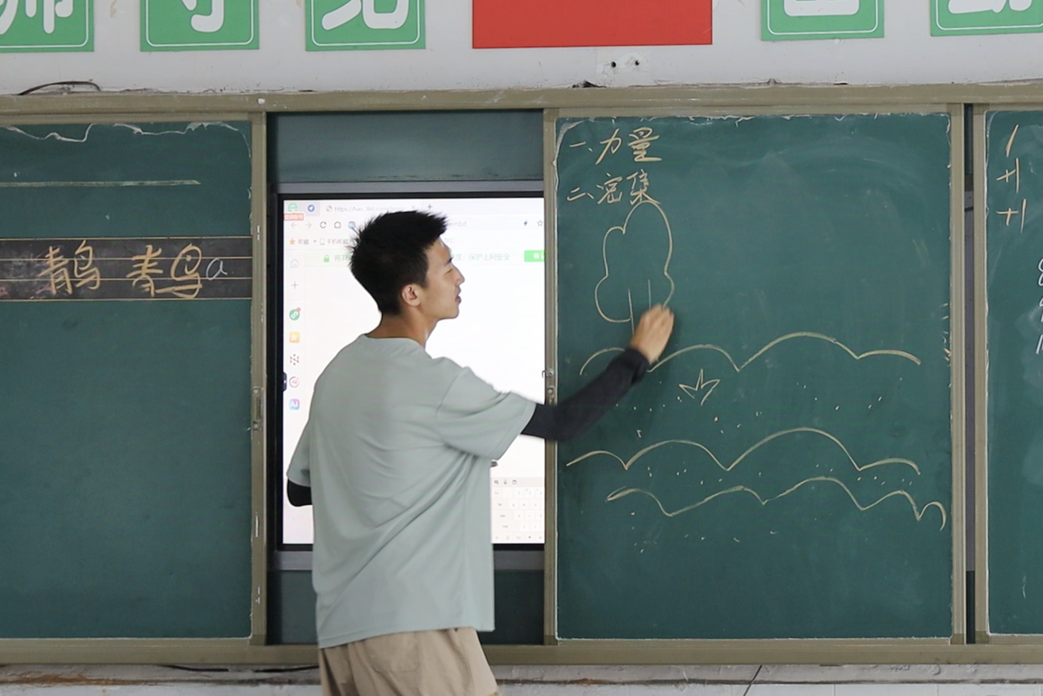 在线条舞蹈课堂上,实践团成员播放轻快、低沉等不同风格的乐曲,引导学生感受旋律起伏,跟随节奏韵律用画笔将脑海中的画面呈现于画纸,将抽象的旋律转化为具象的视觉作品。