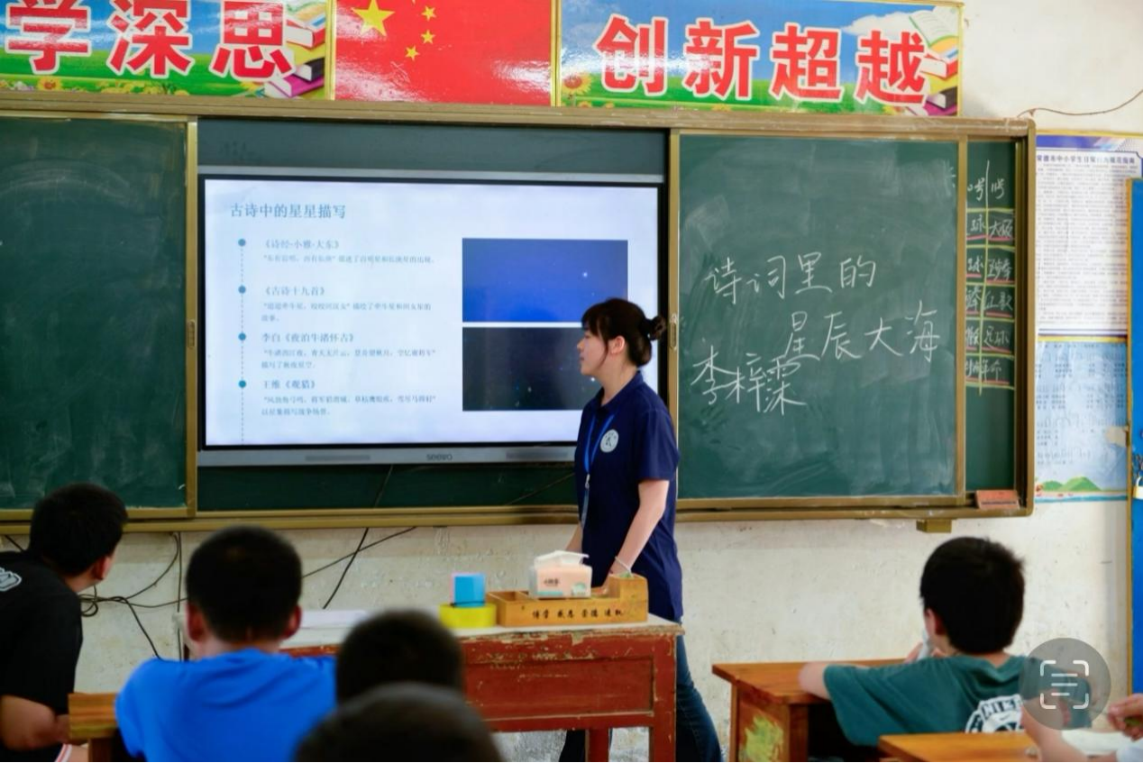 互动环节有仿写《观沧海》、“星辰大海”诗词接龙、分组朗诵等活动,提升孩子们多方面能力。在乡村教育资源匮乏下,“潇湘武韵”诗词课程为学生提供优质诗词文化教育,助其理解诗词、感受文化魅力,推动全面发展,为乡村人才培育注入文化力量。