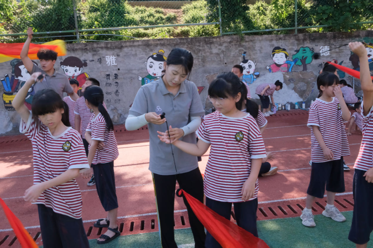 彩带龙课上,赵纯一、赵翊成分步演示并指导,传授“龙出宫”等技法,学生练习挥摆、缠绕,掌握发力与轨迹。赵纯一的理论课按时间梳理武术演变,结合视频解析太极等流派特点,阐释与传统文化的关联。