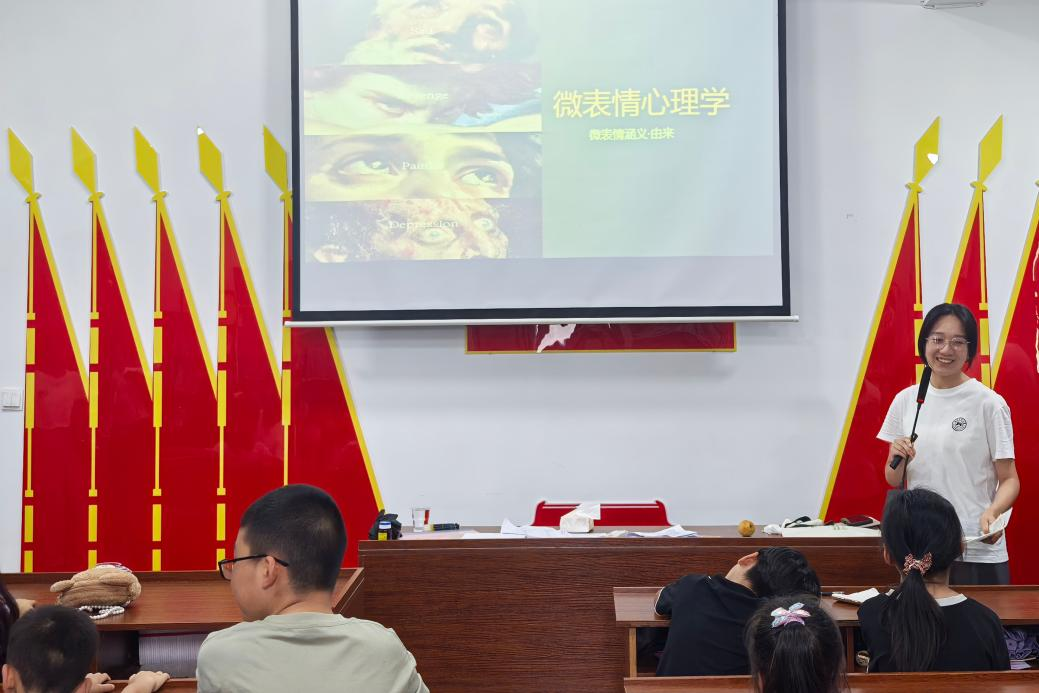课程伊始,主讲人从人类的六大基础情绪说起,教会同学们识别情绪的外在表现。在主讲人的解读下,同学们渐渐学会运用微表情的视角去探索情感。随着课程的深入,主讲人通过解析综艺、影视片段及日常对话案例,带领同学们学习了微表情表达分析及情绪的表达规则,让同学们了解了非语言交流在人际沟通中的重要性。介绍结束后,为让同学们理解课堂内容,主讲人邀请大家分组模仿微表情,参与者两两配对演练,通过镜面反馈练习情绪识别。