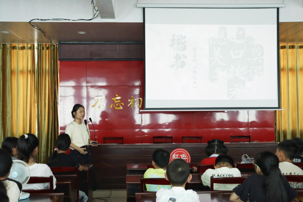课程内容聚焦中国书法艺术中的楷书门类。支教老师系统介绍了楷书的基本概念、发展历程及其作为汉字规范书写体的重要地位,重点深入讲解了唐代书法大家颜真卿及其创立的“颜体”楷书。老师着重分析了“颜体”楷书的典型艺术特征,包括其结构、笔力等特点。课堂上展示了颜真卿的代表作《多宝塔碑》等经典碑帖的范字,供学生们观摩学习。