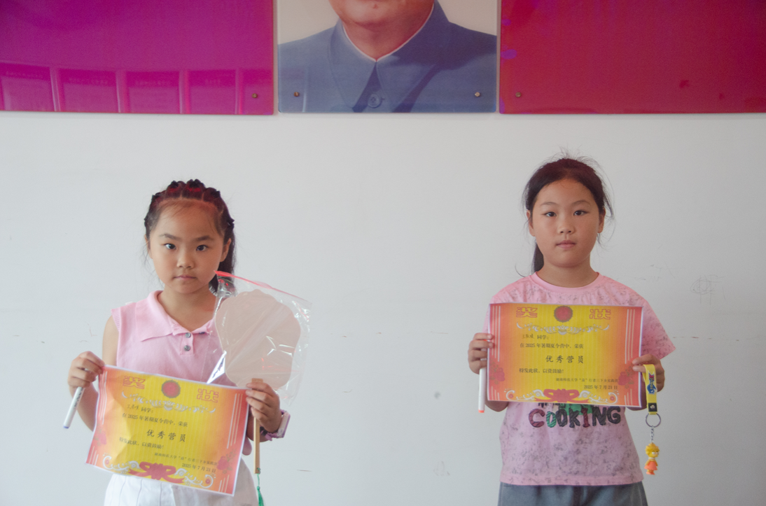 演出中场举行了颁奖仪式,实践团为表现突出的小朋友颁发奖状和奖品,肯定了他们在夏令营中的积极参与和出色表现。这些奖品不仅是对孩子们努力的肯定,更是对他们未来成长的激励。