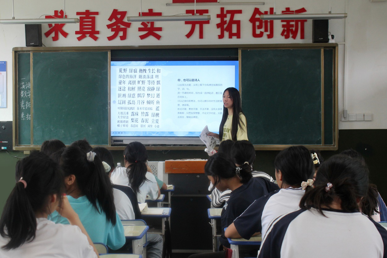 课程围绕拼贴诗和三行诗两种诗歌形式展开教学。实践团成员以“青春是挥洒的汗水”等范例引入,解析了拼贴诗的创作精髓:从现有文本中筛选、剪裁并重组文字,赋予其新意境。随后实践团成员通过对比传统诗歌,阐释了三行诗“凝练性”特点及如何在三行内浓缩情感与主题。