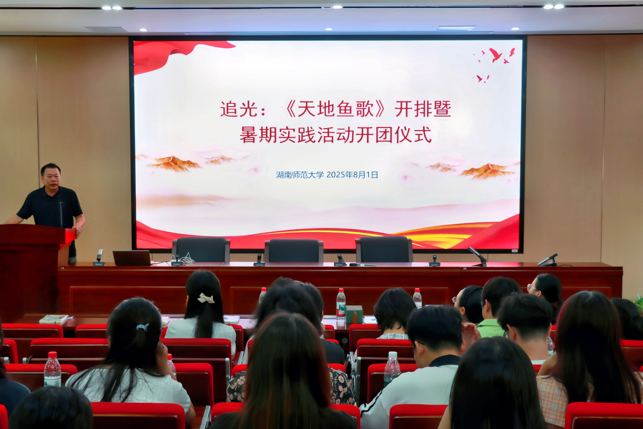 (通讯员 谭伟静 李睿方 郑淑娟)8月1日上午,文学院“追光·天地鱼歌”赴长沙市望城区暑期社会实践团在文渊楼216教室举办《天地鱼歌》开排暨暑期实践活动开团仪式。我校文学院副院长岳凯华、科学技术协会李文凯老师、美育中心胡碧瑜老师、《天地鱼歌》项目负责人兼追光实践团队指导老师曾小明以及追光暑期社会实践团全体成员参加。