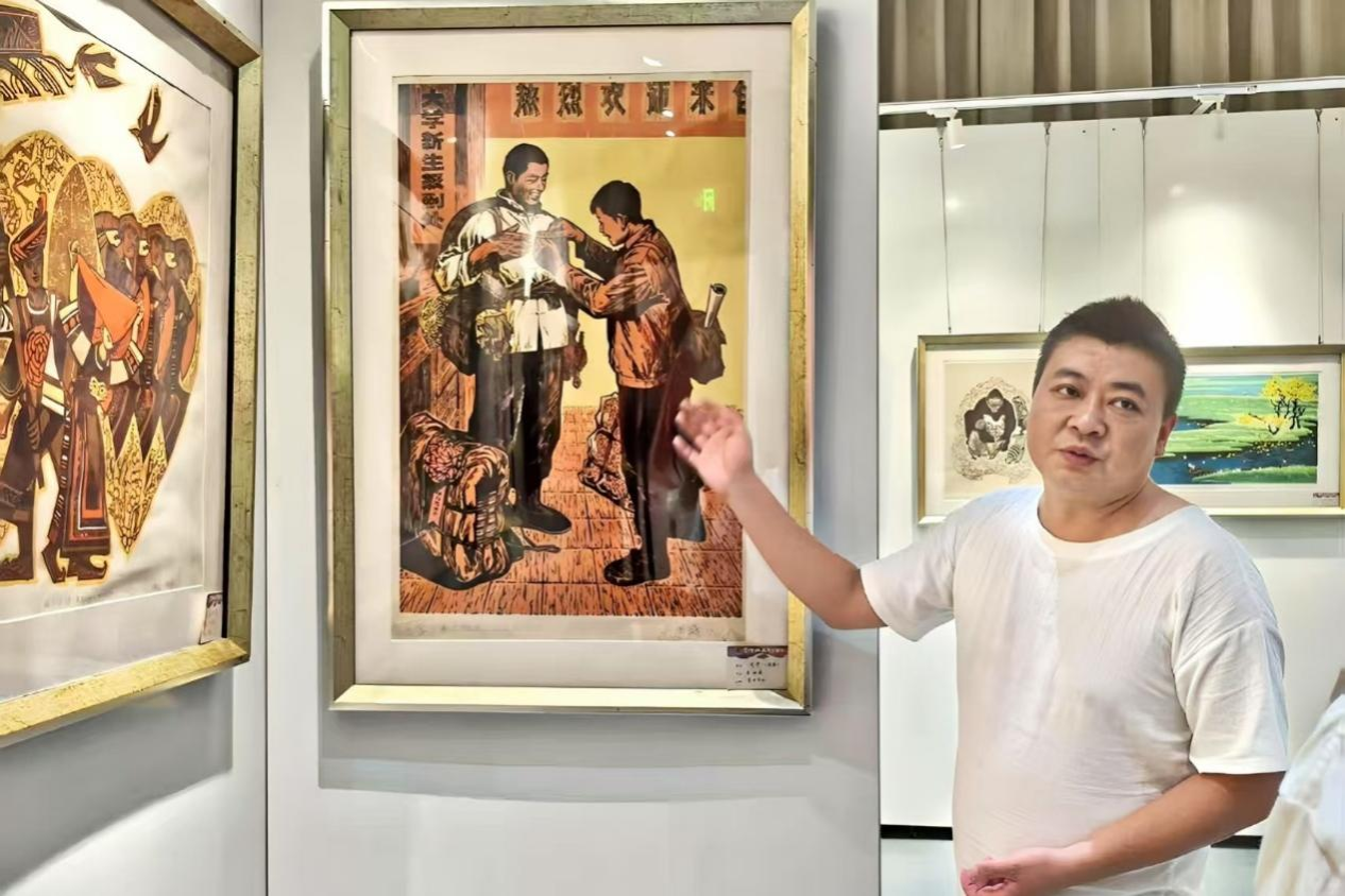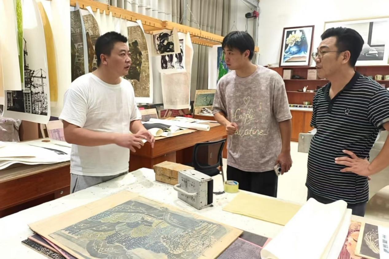 实践团在工作人员的陪同下参观馆内藏品陈列。展览系统呈现从传统农耕文明到现代工业主题的演变历程。展览中,常宁版画专题展区成为重点参观内容。该展区集中展示黑白木刻、套色版画等不同技法,清晰呈现各类技法的艺术特色与表现力差异。通过工作人员的讲解,实践团对馆藏作品画面语言及其所承载的时代印记进行剖析。随后,实践团进入常宁版画制作工坊进行现场观摩,了解到绘画设计、雕刻制版、印刷成品这三大关键环节。讲解人员分析水印与油印等不同材质、不同工艺所产生的独特艺术效果,使成员们深刻认识这项非物质文化遗产的制作技艺。