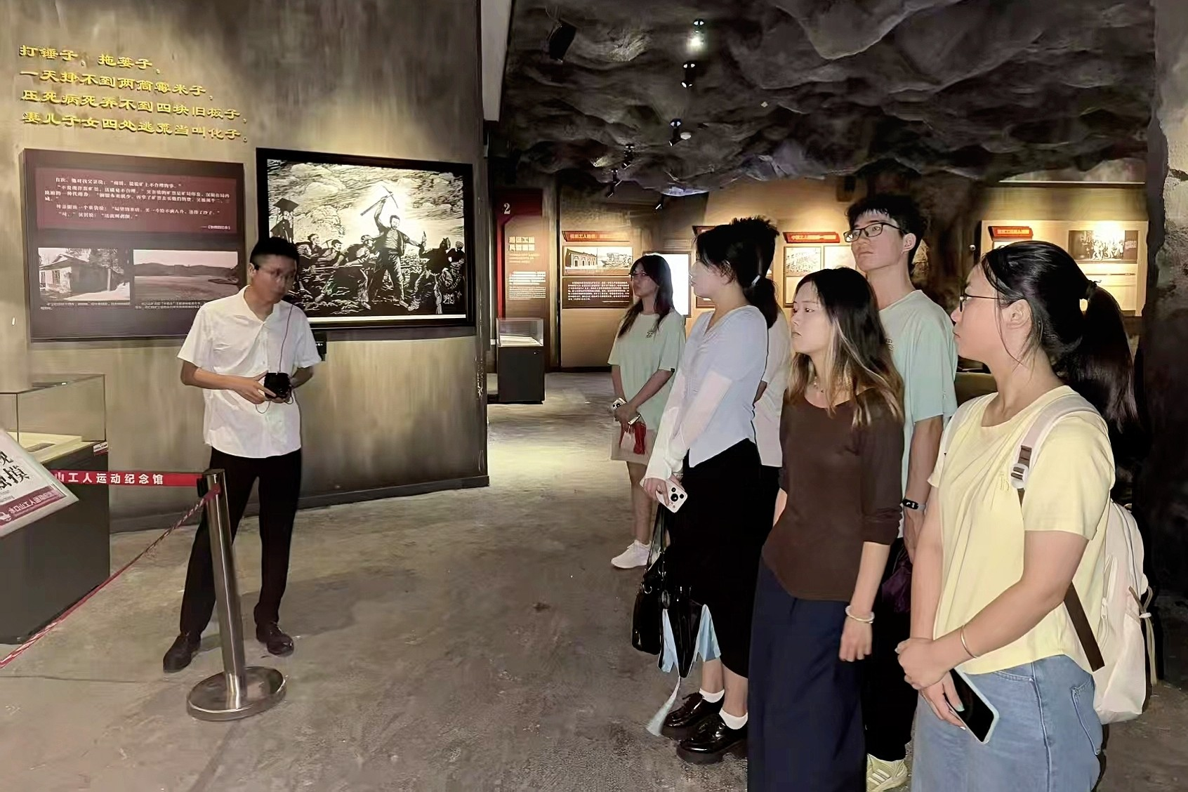 在纪念馆内,调研团在讲解员刘一粟的引导下,通过听讲解、观实物、看场景等方式,系统梳理了水口山工人运动的发展脉络:从毛泽东亲临水口山指导工人运动,点燃革命火种,到蒋先云等革命志士组织成立工人俱乐部,凝聚分散的工人力量,再到水口山矿工人大罢工取得胜利。面对馆内陈列的旧矿灯、工人使用的工具等实物,成员们近距离查看工具磨损痕迹,留意矿灯的构造细节,通过触摸复制品感受当年工人的劳动条件。在罢工宣言手稿展柜前,成员们仔细阅读文字内容,相互交流对罢工诉求的理解,分析工人阶级提出诉求的历史背景。参观过程中,实践团始终保持与讲解员互动,就工人运动的关键转折、组织策略等问题进行深入探讨。