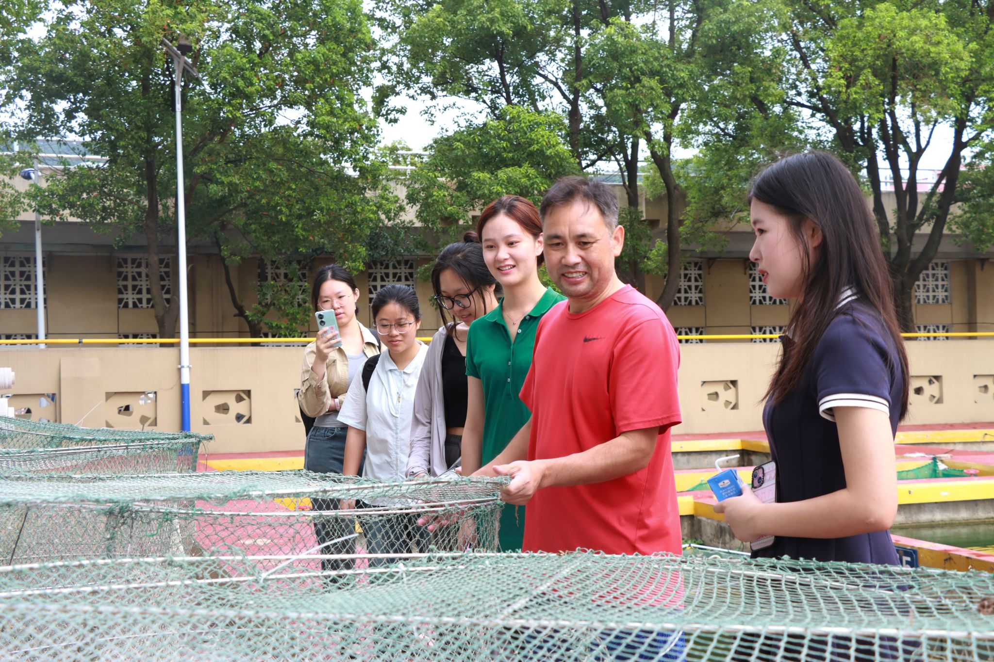 在水产养殖场,实践团成员围绕剧本《天地鱼歌》,仔细观察并记录养殖池中鱼苗的生长状况,同时就相关养殖问题积极提问。李健解答称,鱼苗培育包括投喂的饲料种类、投喂频率与数量以及日常的水质管理措施,如换水周期、增氧设备的使用等。此外,他还提到,在气温变化较大的季节,一些常见的细菌性和寄生虫性疾病会给养殖造成一定的损失,这体现了科研工作的艰巨性。