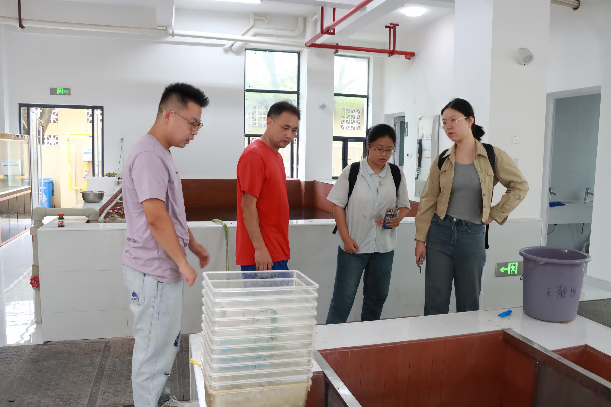 在实验室,李文凯向实践团介绍了四倍体鲤鲫及其母本三倍体鲤鲫,并展示了显微镜等实验用具。曾小明就培育四倍体鲤鲫所需的实验器材进行提问,对此,李健逐一展示并讲解相关设备。