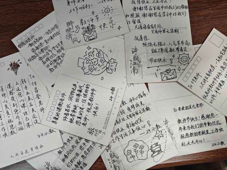 “纸短情长·花香寄情”活动以班级为单位开展,同学们在明信片上写下对老师的祝福并制作扭扭棒花束,由班长统一赠与教师节当天的授课老师,收到礼物的老师们脸上有笑容展现。
