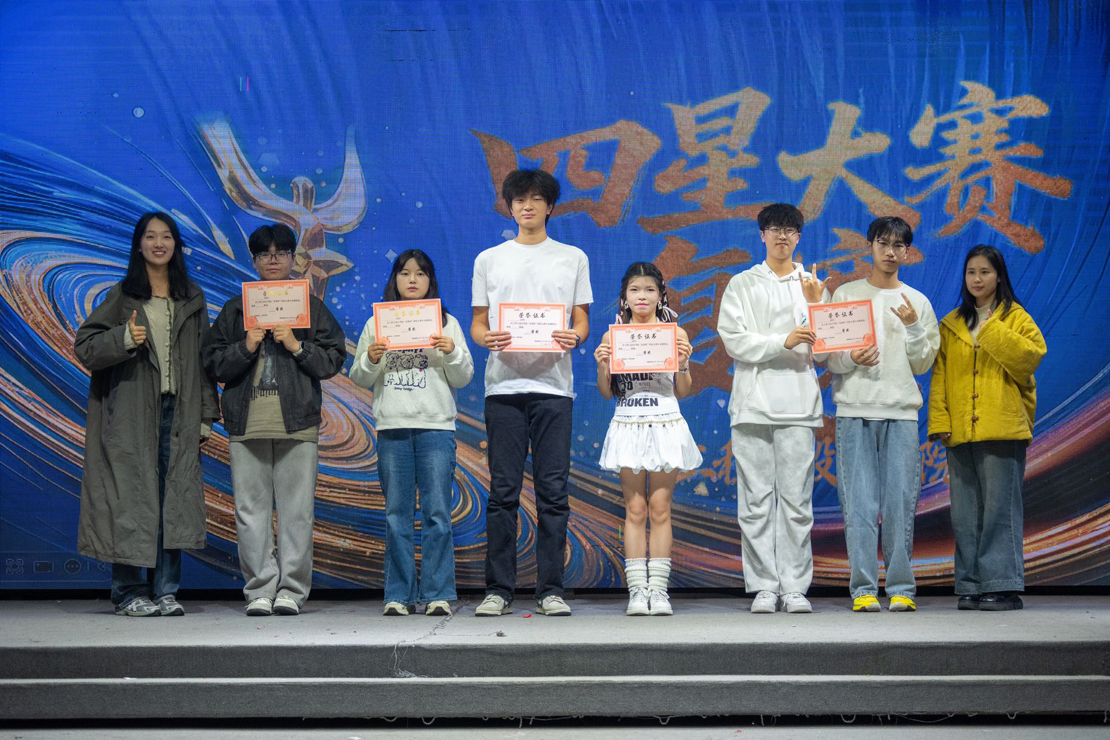 比赛分为歌唱、舞蹈、乐器演奏三大类别,共有14组参与。赛前热场,赵罗芳献上一首《Language》燃起现场气氛。比赛参赛选手们纷纷在舞台上展现自己的风采,其中歌星组选手吴贝在歌唱《可惜不是你》时,凭借灵动的歌喉获得了现场评委及观众的一致好评。评委团从技巧表现、艺术感染力、舞台风貌、作品完整度等多个维度进行综合评分,择优推选出歌星一等奖、舞星一等奖各两组,乐星一等奖一组代表学院参加校级四星大赛。比赛结束,毛奕婷、陈雅文为获奖选手颁发证书,全体全体工作人员、参赛选手与评委团合影留念。