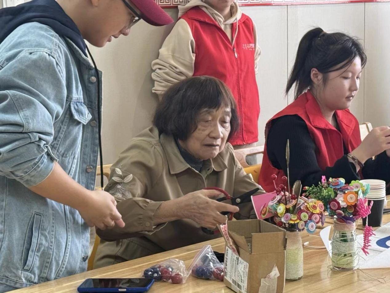活动分为手工制作和互动游戏两个环节。在手工区,志愿者们耐心引导老人们制作“纸杯DIY花篮”和“茱萸香囊”。老人们在志愿者的协助下,一步步完成剪裁、缠绕、粘贴等步骤,手中逐渐呈现出自己的手工作品。一位参与制作的奶奶笑着说:“很久没做手工了,今天特别开心,感觉自己又年轻了!”