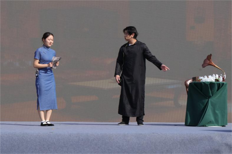在舞台上,演员们身穿代表不同身份的服装,用表演重现历史,以台词再现经典,通过招新戏《烽火电波》,展现社团风貌的同时招揽了大量观众。表演结束之后,演员们保持角色状态,回到社团招新摊位,与同学们进行互动,邀请观众模仿剧中台词与动作,以沉浸式体验拉近与观众的距离,吸引了数百名学生现场报名。