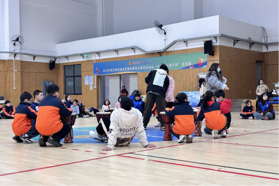 在套圈游戏过程中,志愿者将各类小礼品摆放至指定位置,引导孩子们站在规定线外尝试抛圈,志愿者则在旁协助维持秩序,保障每个孩子都能体验游戏乐趣。这一环节不仅让孩子们在轻松的氛围中感受互动的快乐,更在排队、协作的过程中潜移默化地提升社交规则意识。套圈游戏结束后,随即进入非洲鼓击打体验环节。他们先为在场儿童分发非洲鼓,逐一指导正确握拿鼓槌的方式,再通过简单的节拍示范,带领孩子们熟悉基本节奏并跟随节奏击打鼓面。最后集体唱歌环节,志愿者播放伴奏引导孩子们跟随旋律演唱。